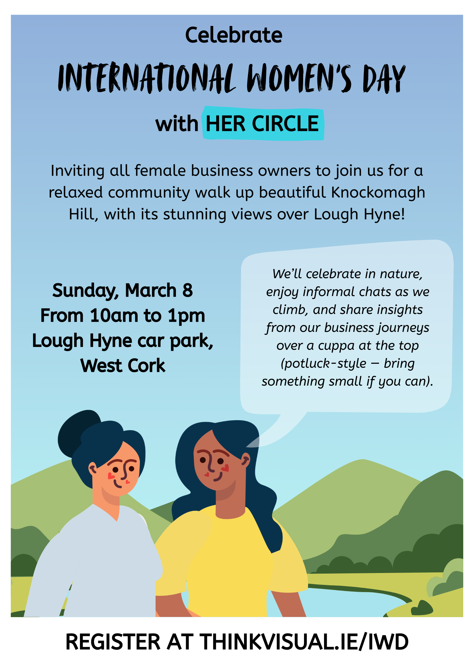 Join us this International Women’s Day for a relaxed community walk up beautiful Knockomagh Hill, with its stunning views over Lough Hyne and the Atlantic beyond.